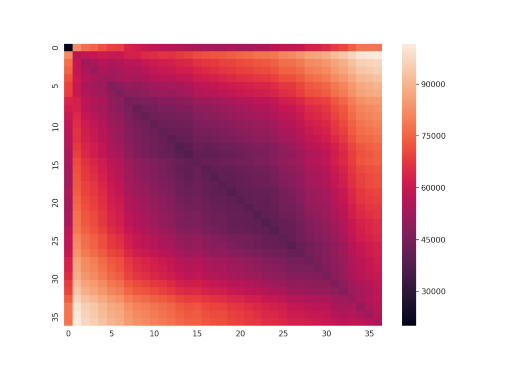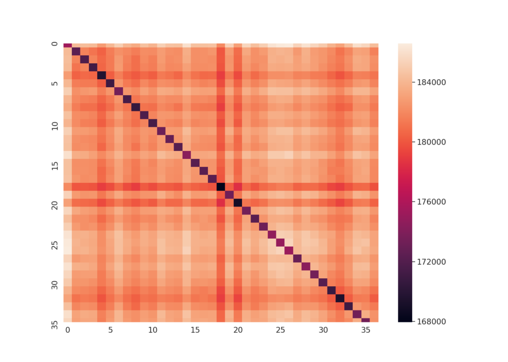 The discriminative improvement is directly quantifiable. Evaluated with ELD (a custom sequence distance metric introduced below) on a 36-button touchpad dataset collected from 13 subjects, raw signal representations yielded an ANOVA f-statistic of 58.26 (p = 0.00) separating same-location from different-location key-presses. MSD raised that to 2,279.20 (p = 0.00), an approximately 39× increase in group separability, while also reducing conflation between nearby buttons. The heatmaps below make this visible: the diagonal sharpens and the off-diagonal structure clears substantially under MSD.