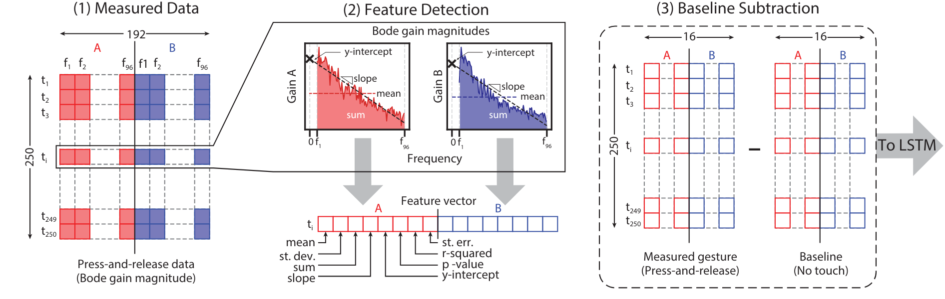 Feature construction over frequency gain values of signals from both electrodes: (1) the raw data is composed of 250 time instances and 96 frequency values per signal, for a total of 192; (2) statistical features are computed over the frequencies per time step; (3) baseline is subtracted from key-press data. From McDonald et al. (IMWUT/UbiComp 2021). Figure in collaboration with Richard Vallett, Center for Functional Fabrics, Drexel University.
