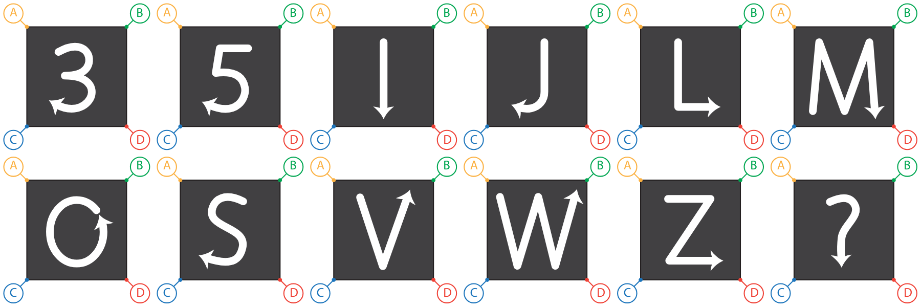 The set was also designed as a first step toward a broader alphanumeric recognition system and, more generally, toward fabric-based communication interfaces, rather than as a convenient sample of gestures.