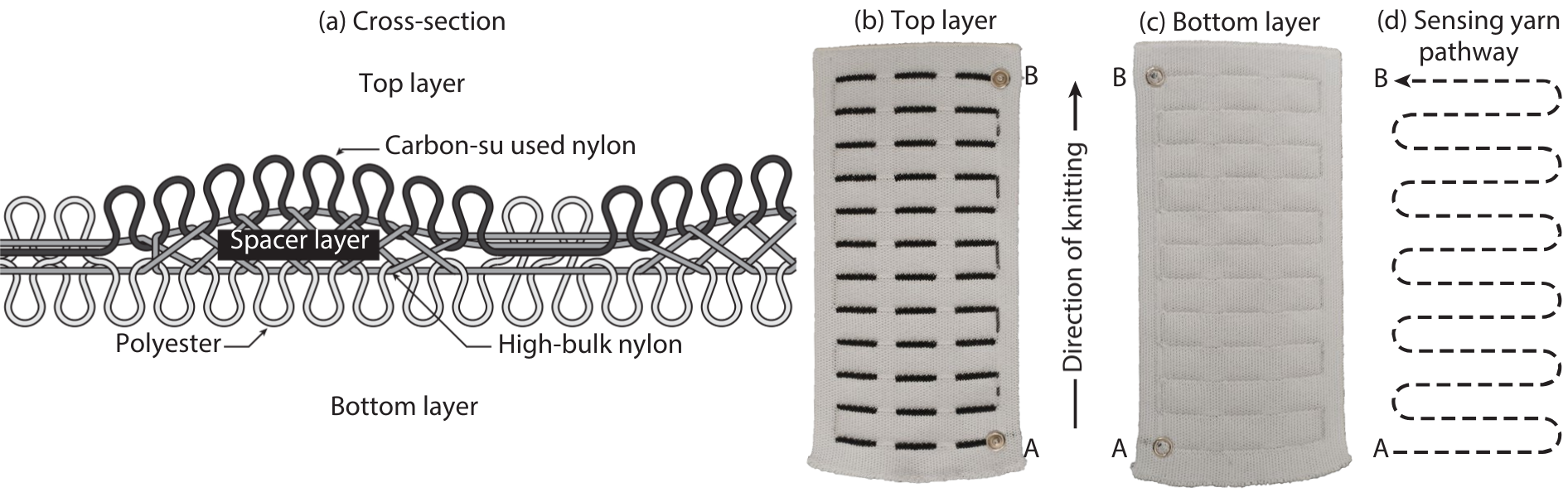 Digitally knitted capacitive sensors. Left: sensor design and construction. (a) Illustration of the layered structure formed by digital flatbed weft knitting with conductive carbon-coated nylon yarn and non-conductive polyester yarns. (b) Top layer of a completed sensor, with darker lines indicating touch areas. (c) Bottom layer of the completed sensor. (d) Serpentine conductive-yarn pathway formed by the knitting process. Right: real-time sensing controller connected to a knitted sensor through electrodes at the yarn endpoints. From McDonald et al. (IMWUT/UbiComp 2021). Figures by Richard Vallett, Center for Functional Fabrics, Drexel University.