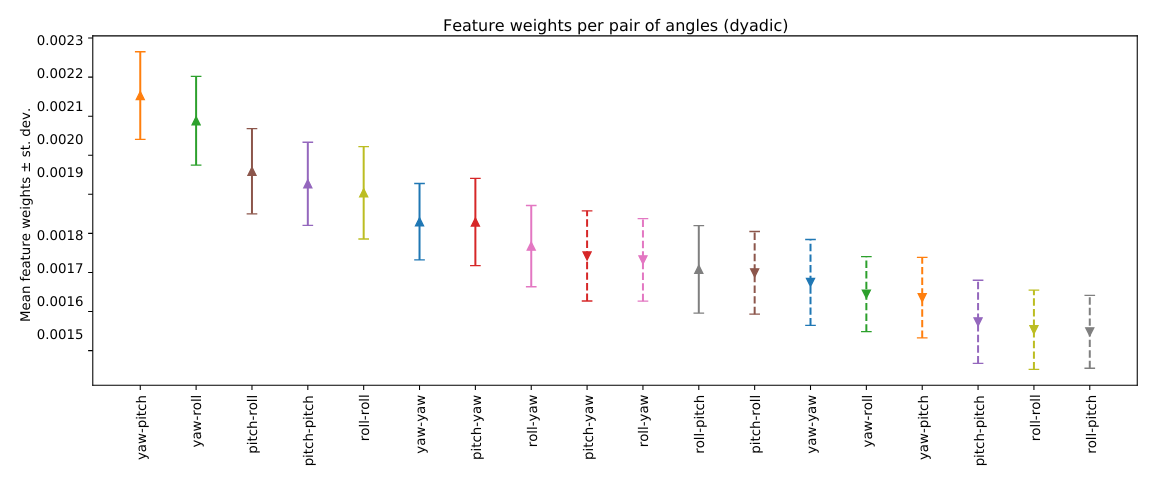 Dyadic feature importance across head-movement types. Mean and variance of SVM feature weights for dyadic features show that movement magnitude is generally more informative than velocity, and that pitch- and yaw-based relationships contribute more strongly than roll to autism classification. Adapted from McDonald et al. (ICMHI 2023).