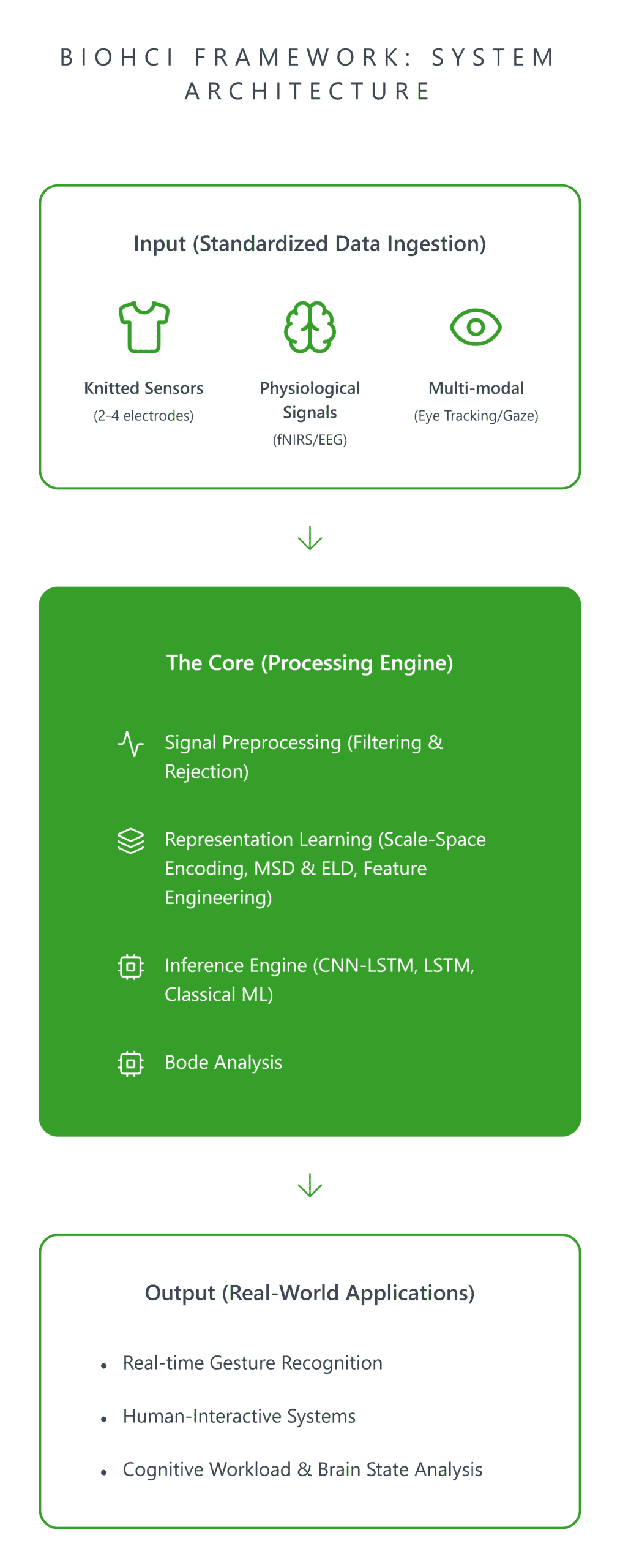 BioHCI is organized as a layered framework for modeling structured human-generated signals under noisy, sparse, and heterogeneous conditions. The architecture separates signal processing, representation construction, and task logic to support reproducibility, cross-domain reuse, and robust evaluation under natural variation. A core design principle is subject-centered abstraction: data are organized around participant-level structure, enabling consistent cross-subject and within-subject evaluation across sensing modalities and applications.