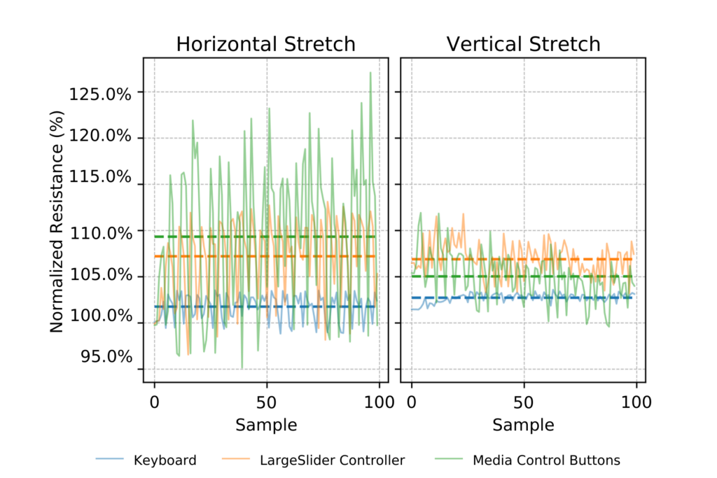 Horizontal and vertical stretching modifies conductive pathway geometry, altering the resistance distribution across the sensing surface. Three 2-electrode sensor designs were tested, the Keyboard, the Media Control Buttons, and the Slider Controlle, each with different conductive yarn routing patterns that produce different resistance distributions and localization strategies. The figure below shows resistance values across 100 consecutive stretch samples for each design, with the signal fluctuating during active stretch and partially recovering, producing structured rather than random variation. The degree of impact depends on the sensor’s localization strategy. The Slider Controller, which measures continuous change along the full length of the circuit, is more tolerant of resistance shifts than the Keyboard, which requires precise resistance separation between discrete button locations.