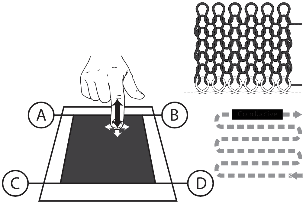 Diagrams of textile sensors. Left: A single-wire touchpad created using conductive and non-conductive yarns that serpentine across the textile surface. The points A and B connect to external sensing hardware. Right: Touchpad created as a planar conductive area with four connections points, A, B, C and D. From McDonald et al. (arXiv preprint 2023). Figure from Richard Vallett, Center for Functional Fabrics, Drexel University.