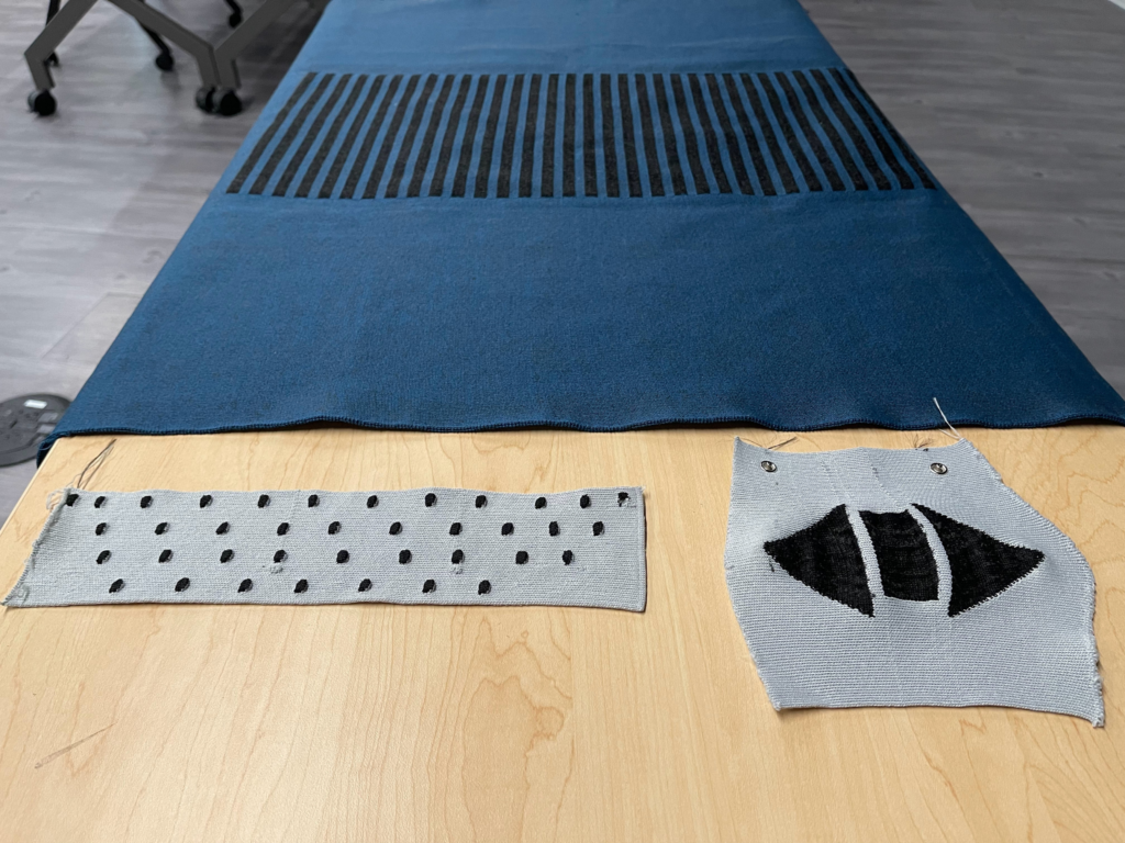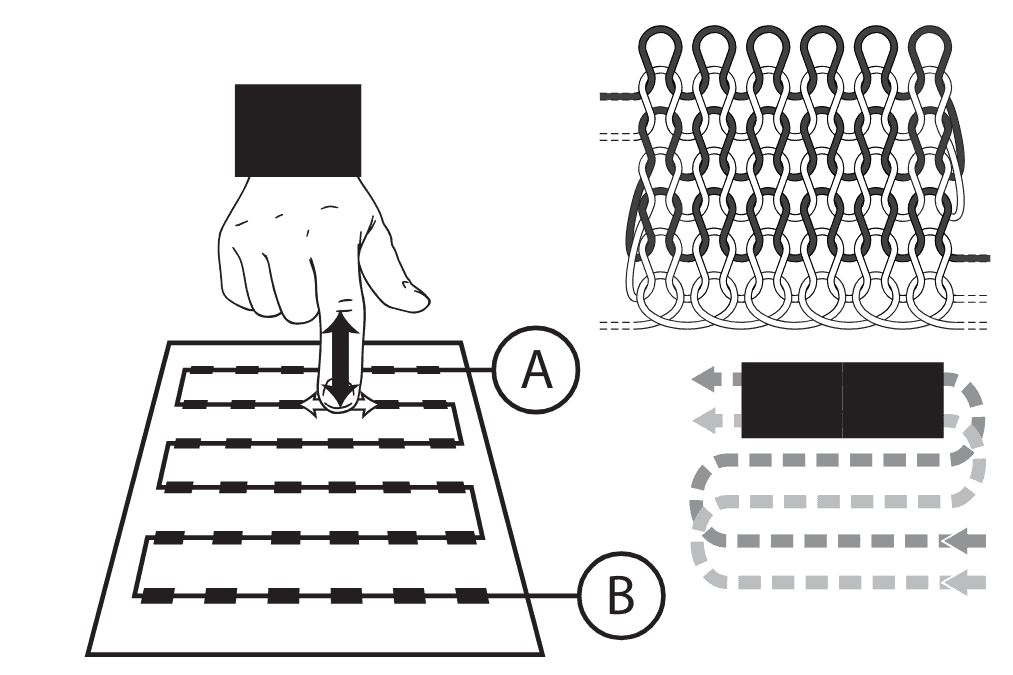 The first configuration used a single-wire touch surface constructed from conductive and non-conductive yarns arranged in a serpentine pattern across the textile substrate, with only two external connection points. This design prioritizes hardware simplicity and minimal wiring while preserving usable spatial information through representation and modeling. Key design choices included: