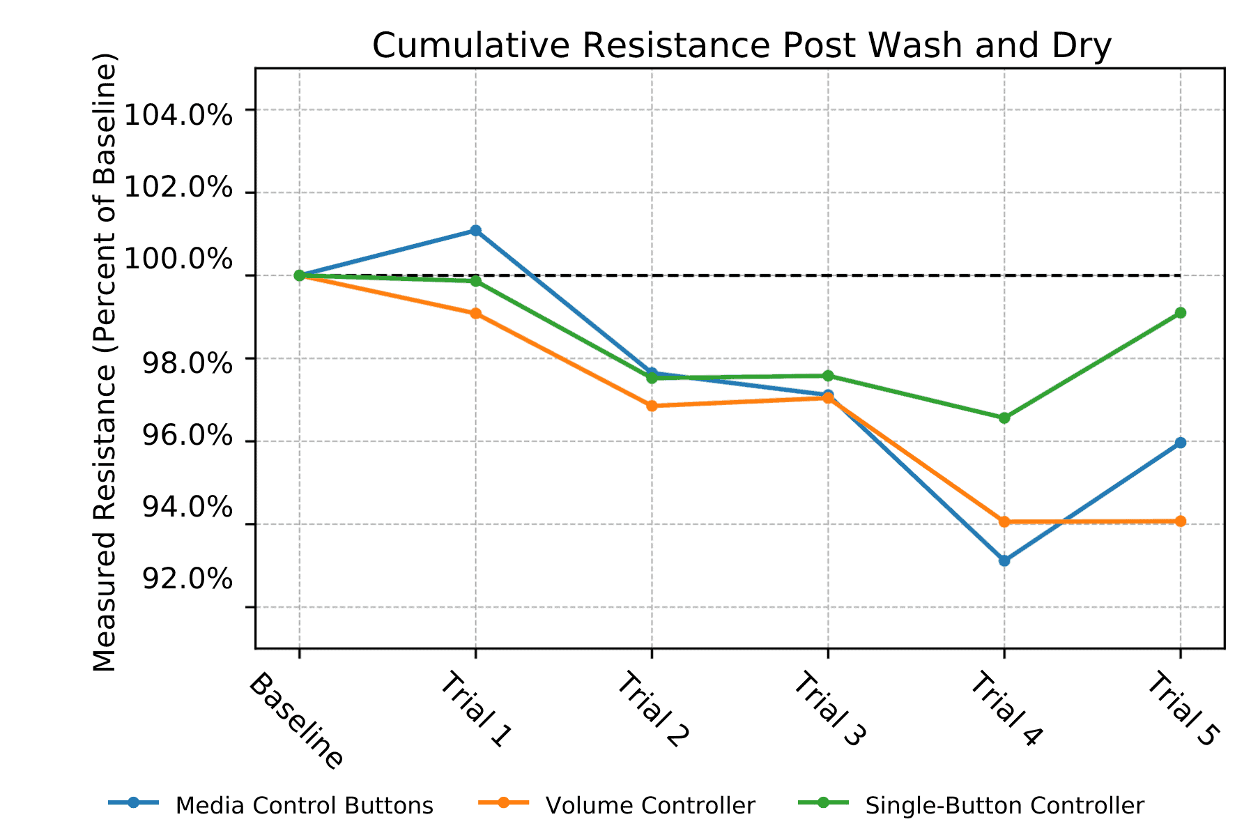 Repeated laundering changes the electrical characteristics of conductive textile structures, but the observed drift remained bounded rather than catastrophic. In the 2-electrode sensor patterns, resistance stayed within 7% of baseline after five wash cycles (McDonald et al. (CHI 2022)). In the 4-electrode configuration, variation across connection pairs ranged from 1% to 31%, again indicating structured change rather than failure (McDonald et al. (arXiv 2023)). From a systems perspective, this means the challenge is not random noise but baseline drift: models should depend less on absolute magnitude and more on relative or structured signal properties. The sensing substrate remained functional across all cycles, supporting viability under everyday textile care, though the direct impact of laundering-induced drift on model accuracy remains an open evaluation question.
